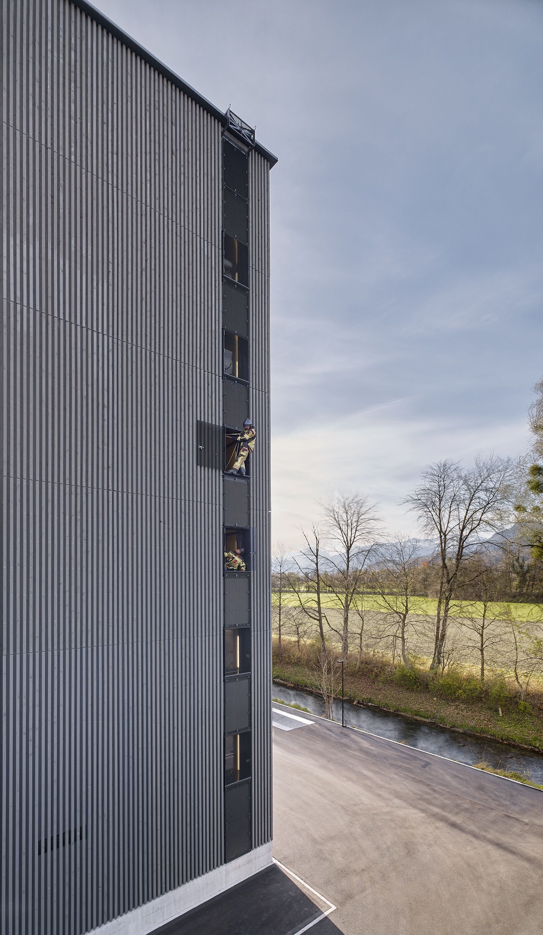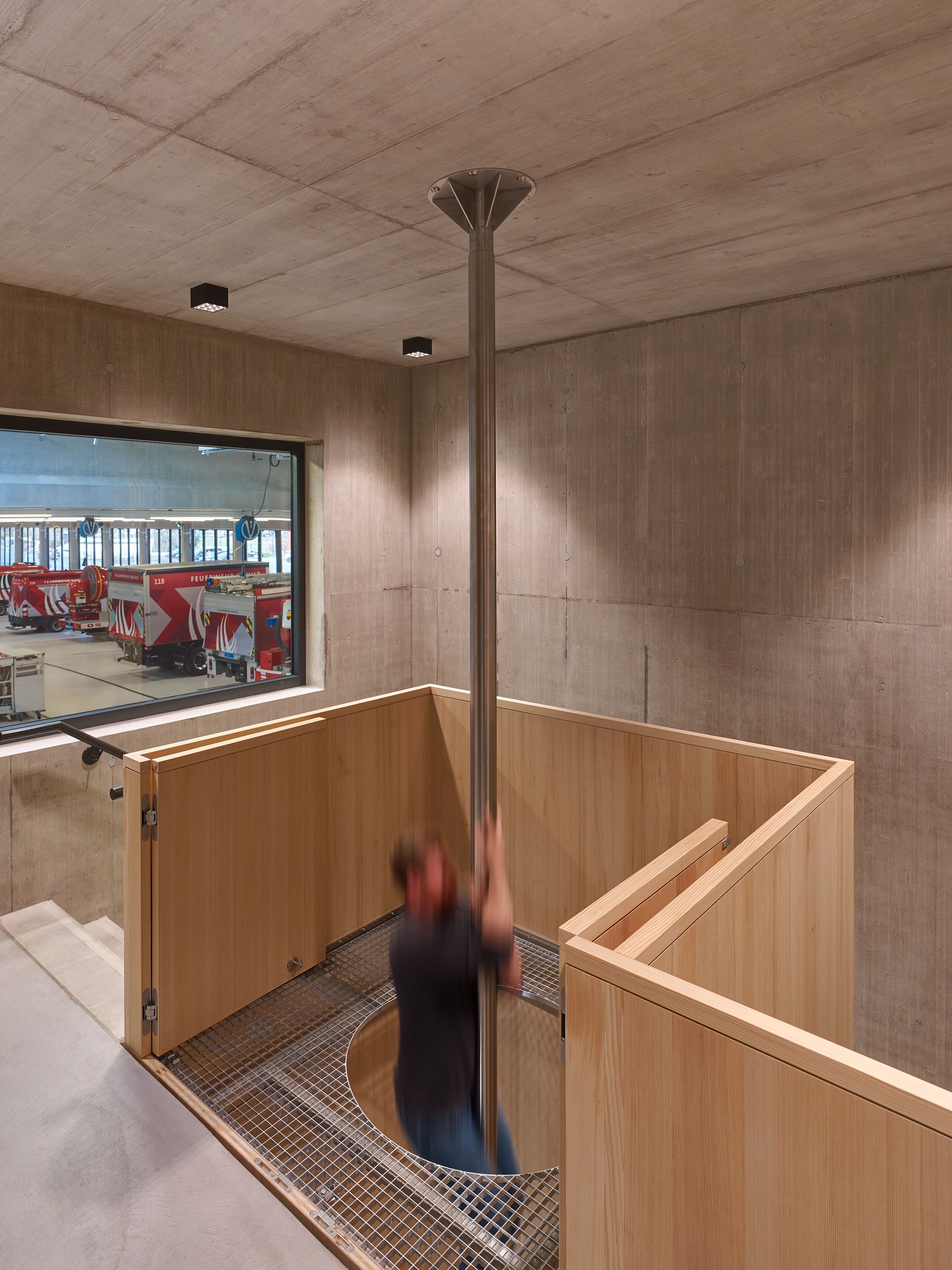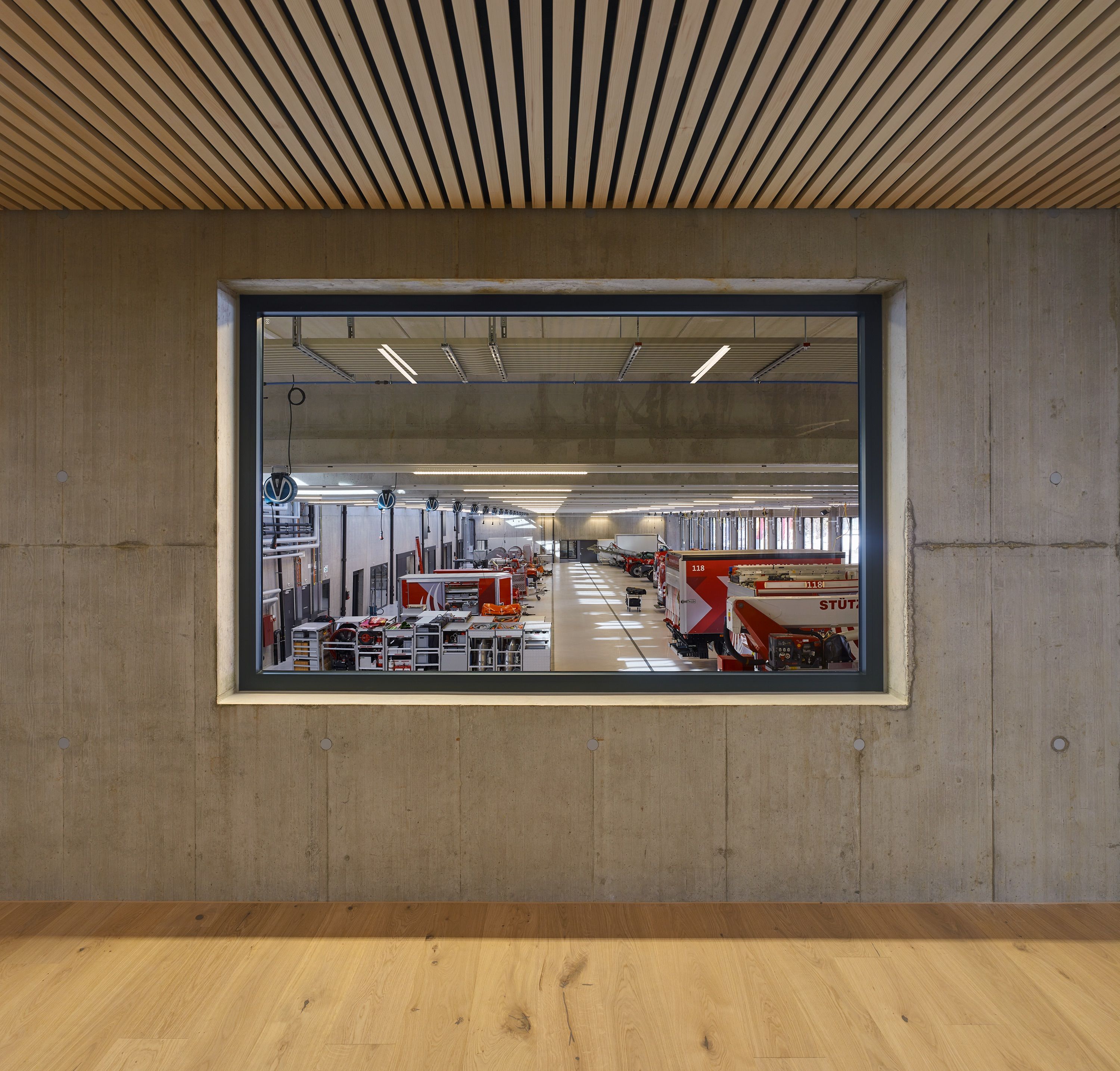 Im neuen Feuerwehrdepot befinden sich die Feuerwehr als Hauptnutzer sowie der Samariterverein. Das Zentrum des Neubaus bildet die Fahrzeughalle mit 16 Stellplätzen. Die weiteren Funktionsbereiche wie Einsatzzentrale, Büros, Mannschaftsräume, Schulungsbereiche und Werkstätten sind peripher an der Fahrzeughalle angedockt. Die Nutzungsbereiche Feuerwehr und Samariter werden über dieselben Zugänge erschlossen, sind aber räumlich getrennt.Der Neubau wurde als Beton-Holz-Hybridbau erstellt. Die Planung erfolgte mit der BIM Methode.